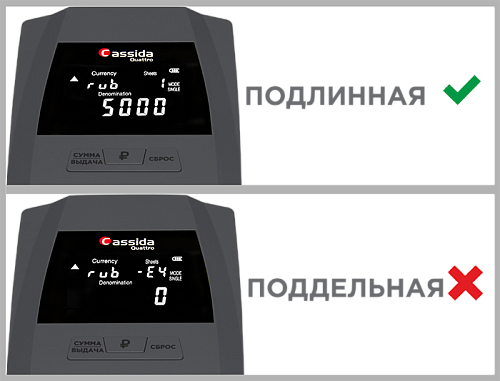 Компактный и надежный детектор Cassida Quattro работает с российскими рублями. Имеет достаточно высокую скорость банкноты и проводит детекцию в режимах: SD: контроль размера банкнот, UV: контроль в УФ диапазоне, MG: магнитная детекция, IR: контроль ИК защиты, DD: контроль оптической плотности, SP: спектральный анализ краски. Работает от сети или аккумулятора, который является опциональным решением. Есть режимы суммирования и пересчета. Для связи с ПК используется USB.