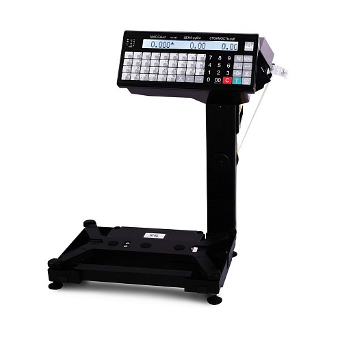 Настольные весы МАССА-К ВПМ-15.2-Т1 с вертикальной стойкой, на которой расположен терминал с прорезиненной клавиатурой и ЖК дисплеем, а так же принтер этикеток. В весы можно сохранить до 20000 товаров. Связь с внешними устройствами осуществляется через интерфейсы RS-232, Ethernet, USB.